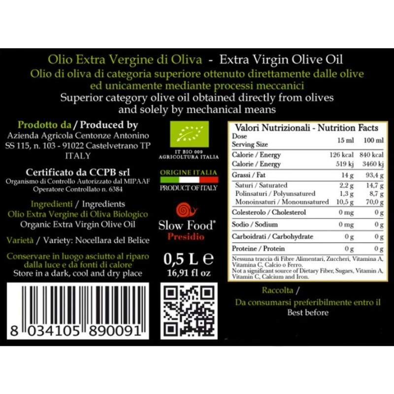 The Extra Virgin Olive Oil Organic monocultivar gift box produced by Centonze is a monocultivar oil of Nocellara del Belice obtained from organic olives grown exclusively within the company Case di Latomie. It is characterized by its medium, round and full fruitiness, and by its particular density and glaze.
