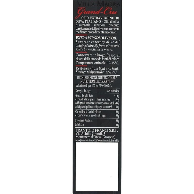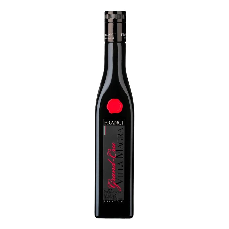 The Extra Virgin Olive Oil Gran Cru Franci is the best production of the olive grove ‘Villa Magra di Franci’. It shows its big structure with a long lasting aroma.