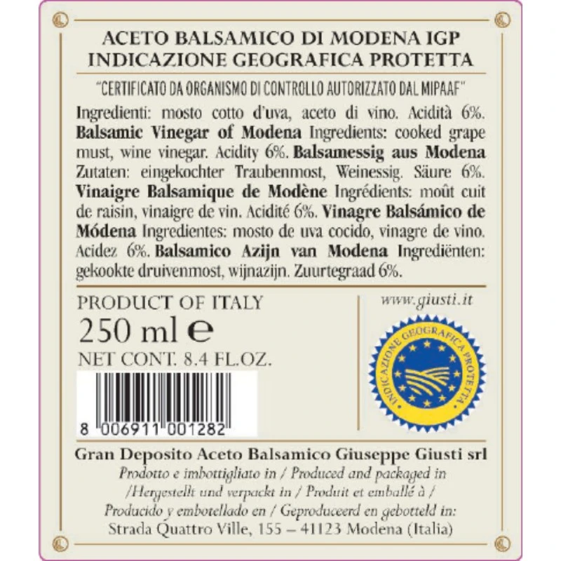 The ultimate pride and expression of the art of Giusti vinegars, the Balsamic Vinegar of Modena IGP 5 Gold Medal Giusti was the personal gift from Uncle Giuseppe to family members. Of great body and concentration, it is distinguished by its extraordinary complexity and rich bouquet of aromas. Notes of plum, black cherries and sweet spices, infused with the fragrances of ancient woods in which it was left to age, persisting long after a taste.