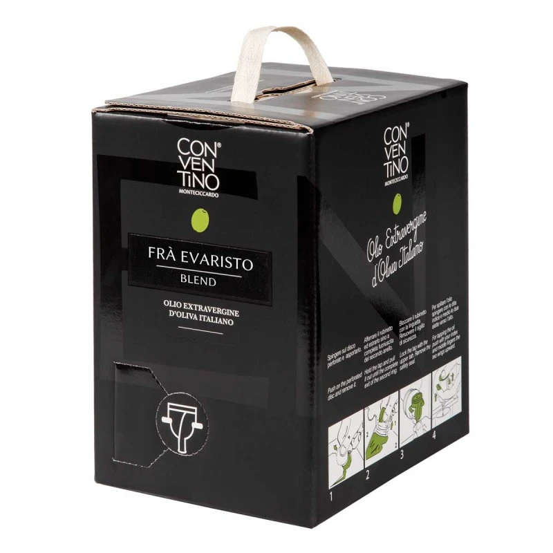 The Extra Virgin Olive Oil Frà Evaristo Bag in Box Il Conventinois an high selection oil, 100% Italian, manufactured with company olives with a premature harvest period.
