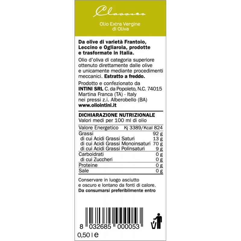 The Extra Virgin Olive Oil Classic is made up of the blend of three different varieties: ‘Frantoio, Leccino, and Ogliarola’, the harvest period occurs during the months of November and December. A versatile and pleasant oil that fits everyone’s flavour.