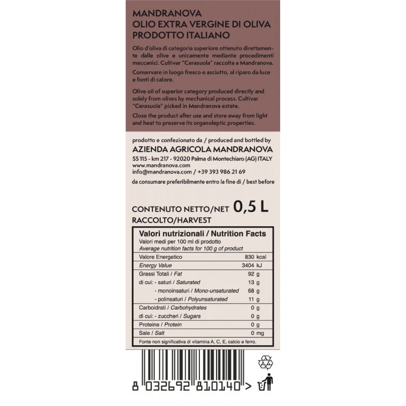 The Extra virgin olive oil Cerasuola Mandranova has significantly tones of Mediterranean area, aromatic herbs, bay leaf and thyme. It is elegant and persistent to the taste with black pepper awards, fresh oregano and almonds.