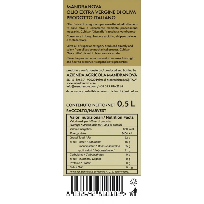 The Extra virgin olive oil Giarraffa Mandranova to the aroma is subtle and harmonious, with hints of lettuce, basil and marjoram. In the mouth it is soft and smooth with hints of white apple, lettuce and basil. Sweet, with spicy notes.