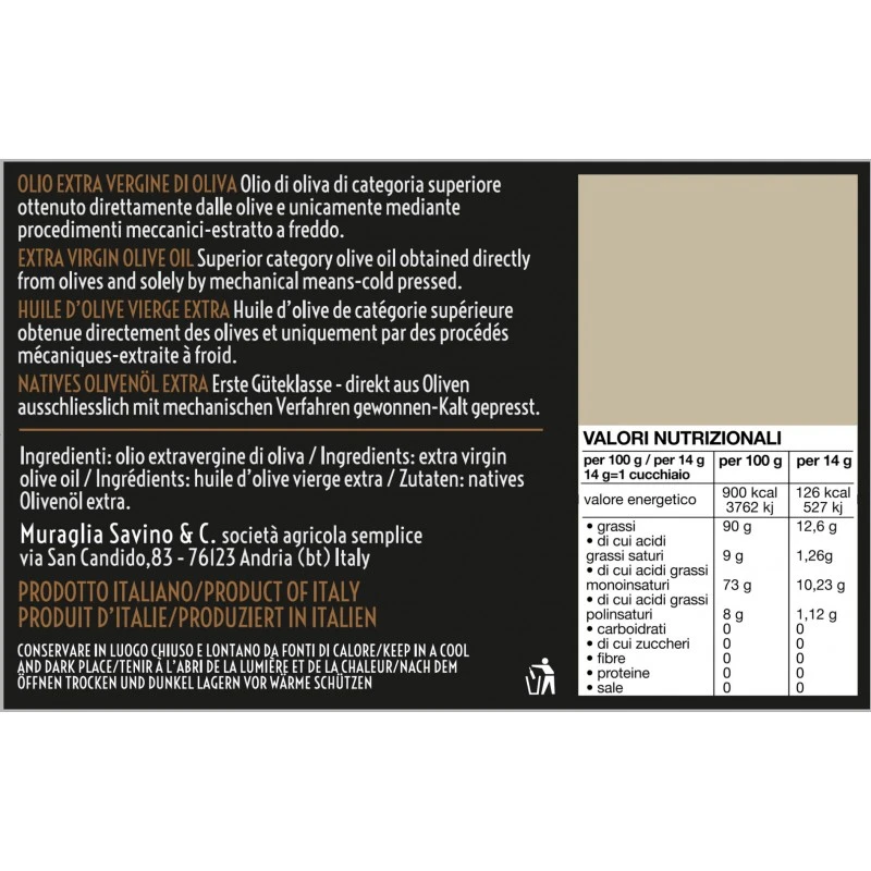 The Extra Virgin Olive Oil Grand Cru Macchia di Rose Muraglia takes its name from the Macchia di Rose soil, selected for its position, to give life to the first Grand Cru. One of the lands with the best position has been selected to have an even more excellent extra virgin olive oil from Coratina olives.