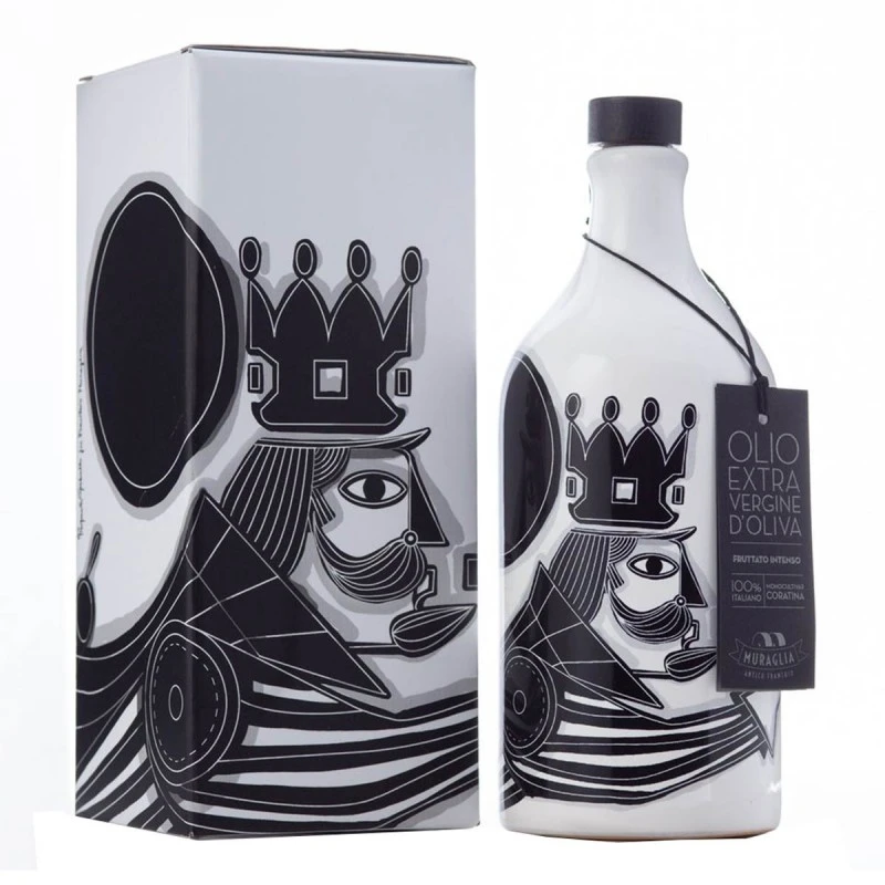 The Extra virgin olive oil King ceramic jar Peranzana Muraglia is a 100% Apulian extra virgin olive oil, from the contents to the container. This is how the bottles containing the precious Extra Virgin Olive Oil Frantoio Muraglia and handmade by Apulian potters for the first time abandon the iridescence of colors to let themselves be enveloped by white strokes and imprint a new design in a first Limited Edition of Orci unique and iconographic based on the geometric dichotomies of the Salento artist Pierpaolo Gaballo.