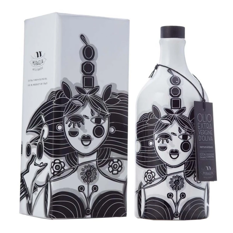 The Extra virgin olive oil Mother Nature ceramic jar Peranzana Muraglia is a 100% Apulian extra virgin olive oil, from the contents to the container. This is how the bottles containing the precious Extra Virgin Olive Oil Frantoio Muraglia and handmade by Apulian potters for the first time abandon the iridescence of colors to let themselves be enveloped by white strokes and imprint a new design in a first Limited Edition of Orci unique and iconographic based on the geometric dichotomies of the Salento artist Pierpaolo Gaballo.