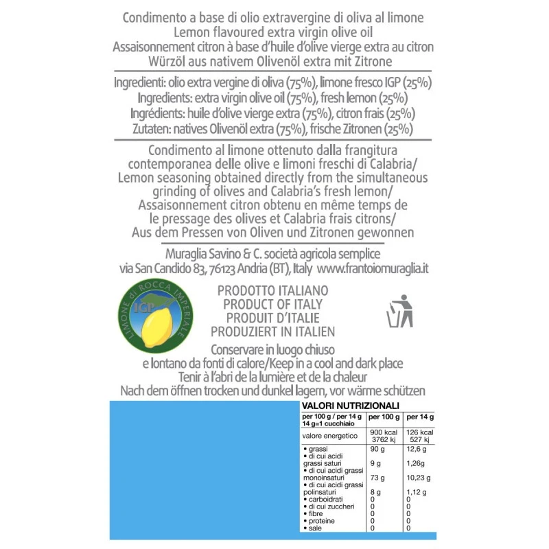 The Lemon flavoured Extra Virgin Olive Oil Muraglia is produced with Lemon IGP from Rocca Imperiale. Frantoio Muraglia has decided to combine the purity of its extra virgin olive oil, a highly selected and sought after raw material produced from the excellence of the lands to create, in effect, a capsule collection of taste, faithful as ever to its DNA. A combination that imparts flavour and achieves its signature style through “fusion”, not only in taste but also in the production process.