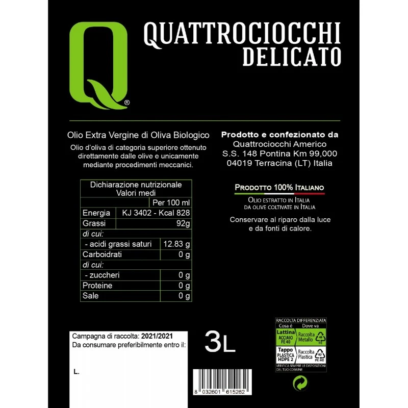 The Extra Virgin Olive Oil Delicato Leccino can Quattrociocch is an extra virgin of excellent choice, 100% Italian, manufactured from olives exclusively from its own farm company of the ‘Leccino’ variety.