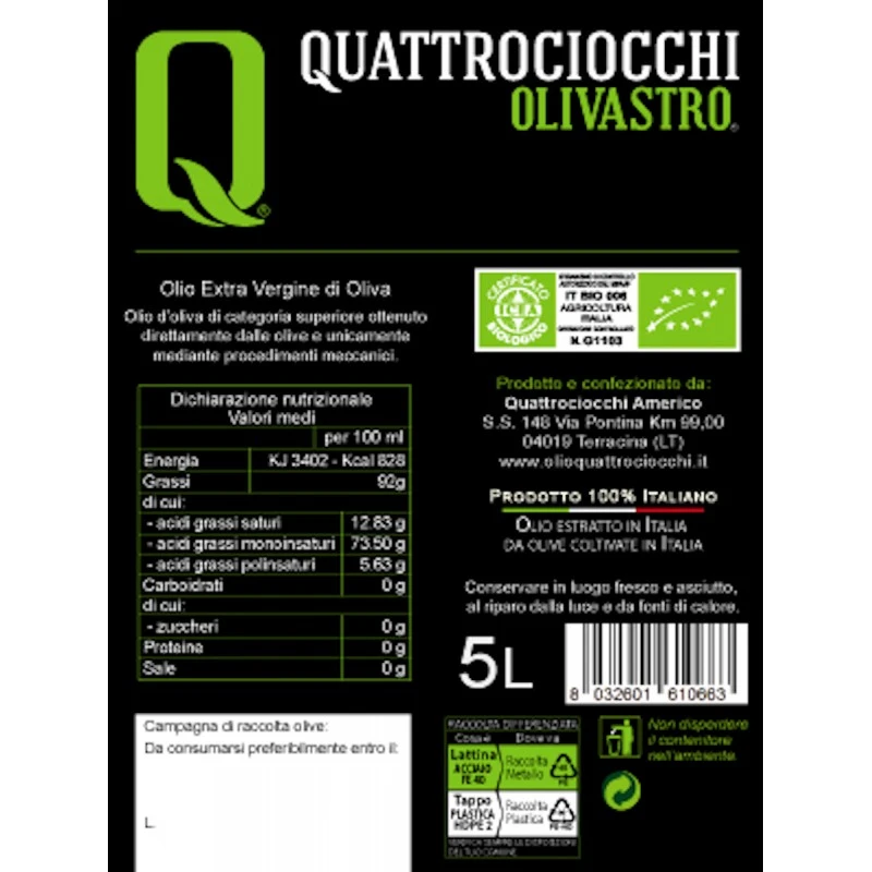 The Extra Virgin Olive Oil Olivastro Organic can Quattrociocchi is an extra virgin of excellent choice, 100% italian, manufactured from olives exclusively from its own farm company from Alatri of the ‘Itrana’ variety.