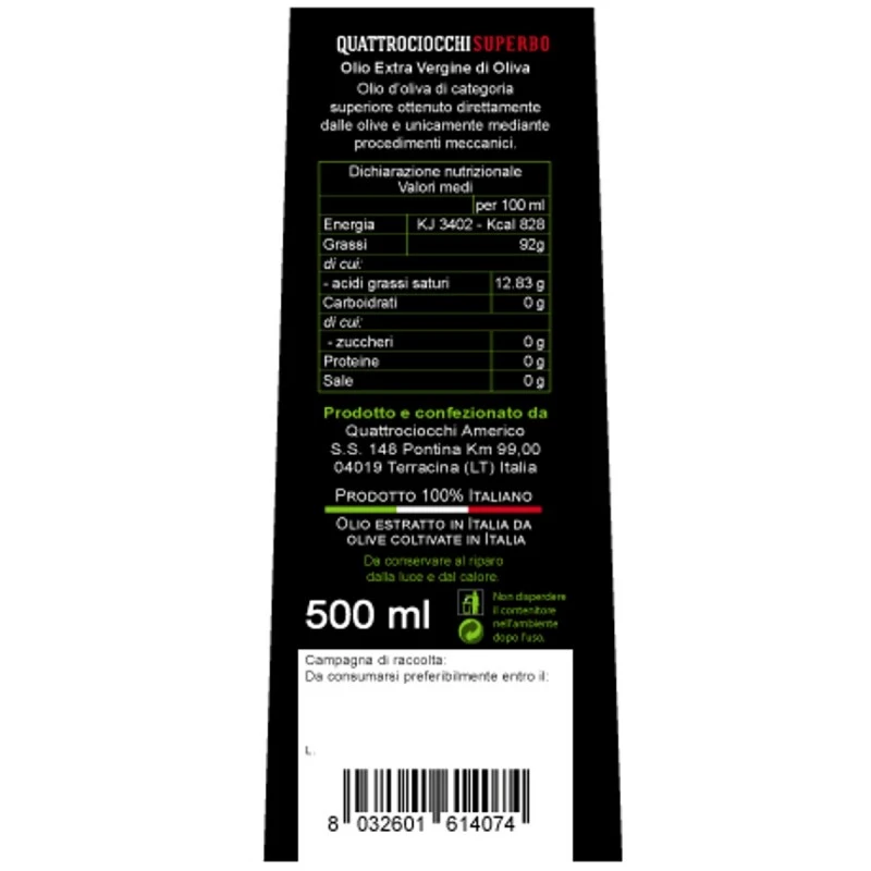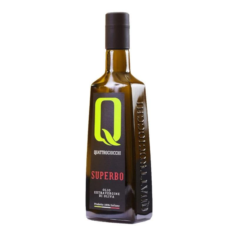The Extra Virgin Olive Oil Superbo Moraiolo Quattrociocchi is an extra virgin of excellent choice, 100% Italian, manufactured from olives exclusively from its own farm company of the ‘Moraiolo’ variety.