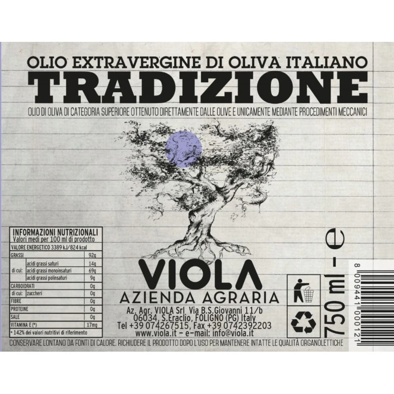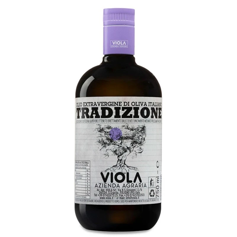 The Extra Virgin Olive Oil Tradizione by Viola is produced from the varieties of moraiolo, frantoio, leccino and other minor varieties of olives. Plants grown on stony and very permeable calcareous soils, placed at an ideal altitude for cultivation; parsimonious in the form and production of the fruit; cure and touch only by the hands of man.